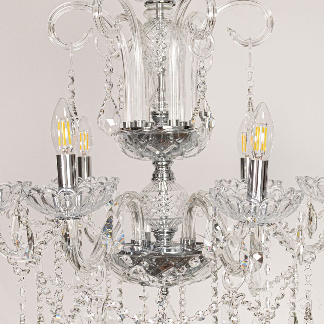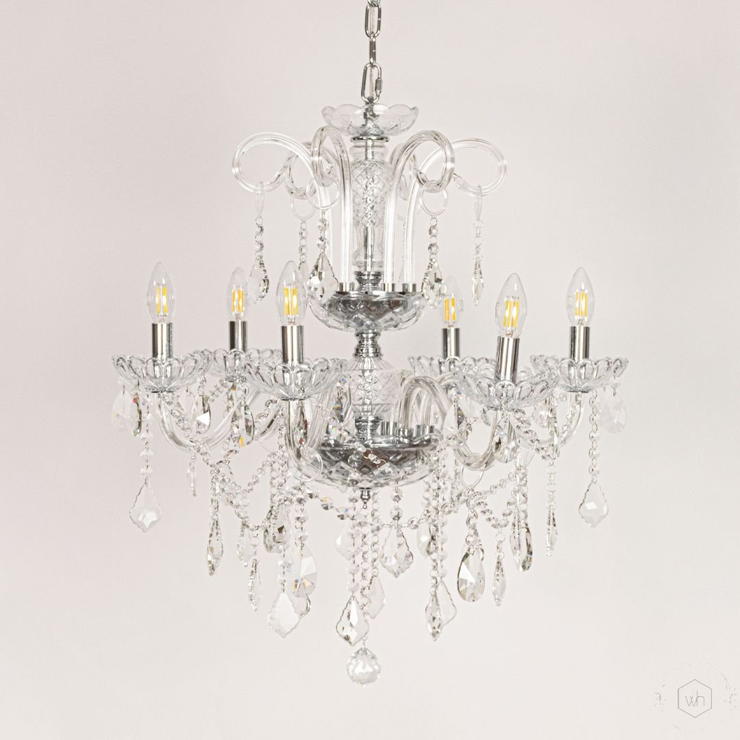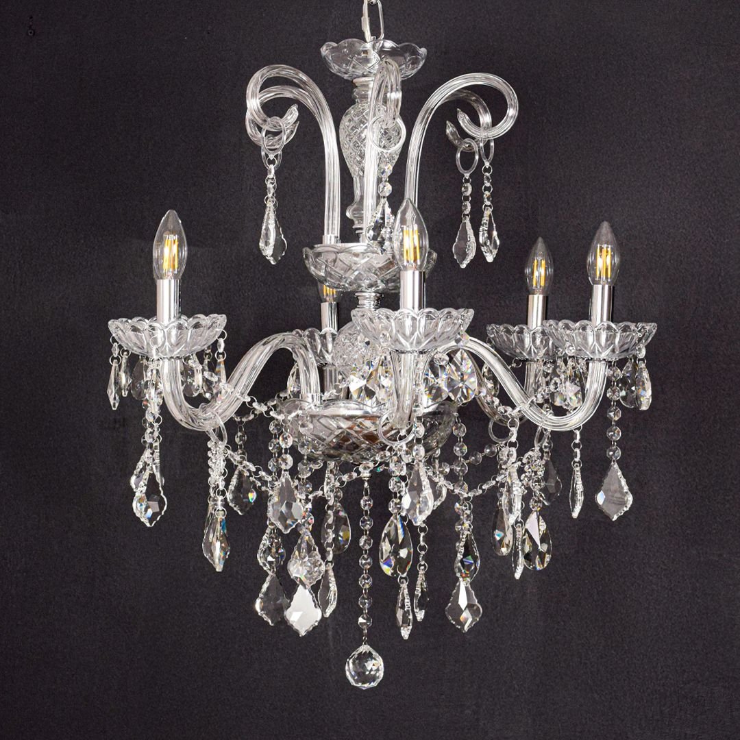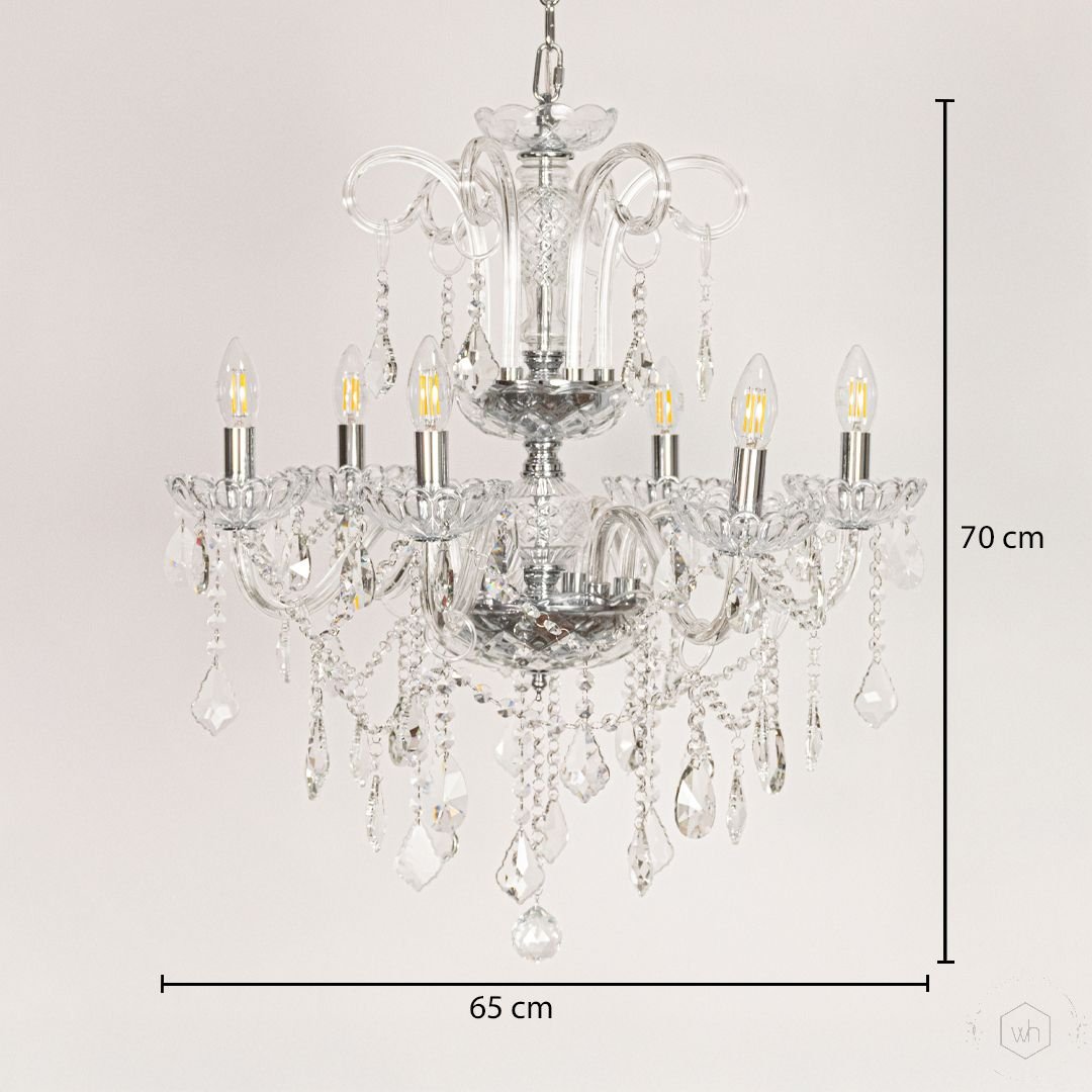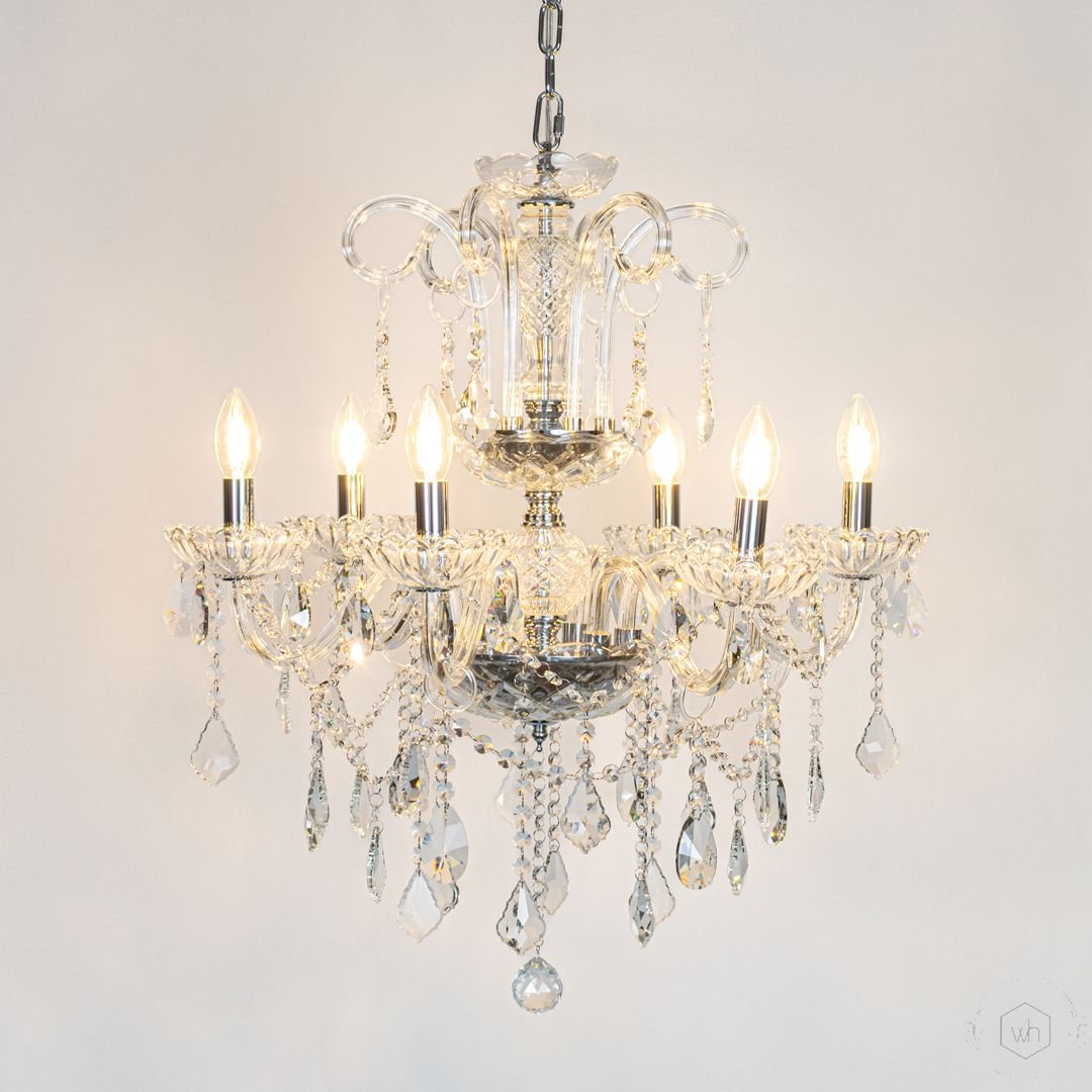 The Belmora 6-Light Crystal Chandelier showcases a breathtaking combination of transparent glass arms, shimmering crystal droplets, and a polished metal frame. Its radiant glow and intricate detailing bring refined elegance and luxurious charm to any interior space.