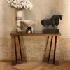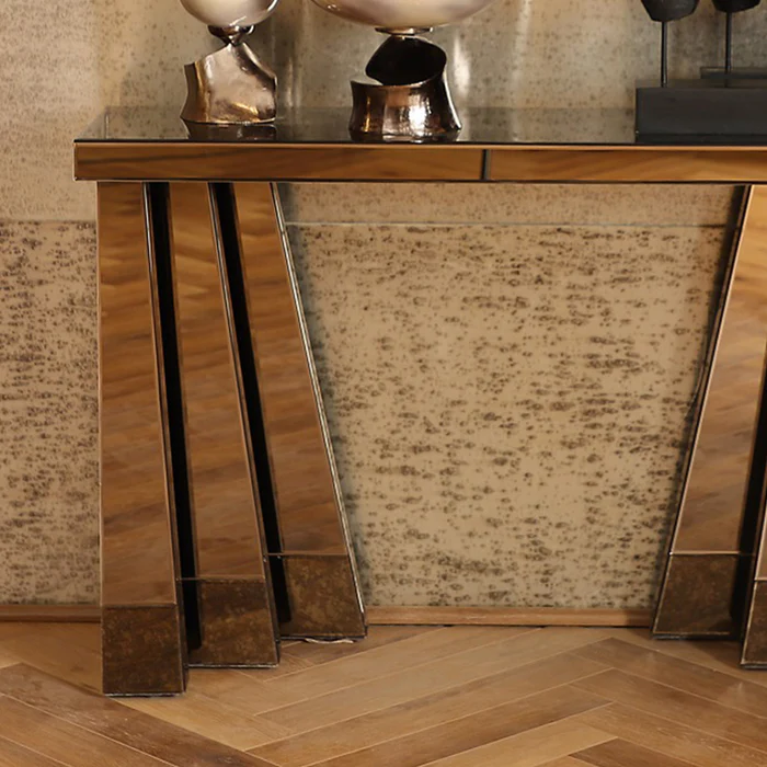 Our impressive brown mirror console table with all its ANTIQUE texture and shading is a peice to behold. The verticle staggered legs add symmetry to the design. This console enhances the beauty of the showpieces that it displays.