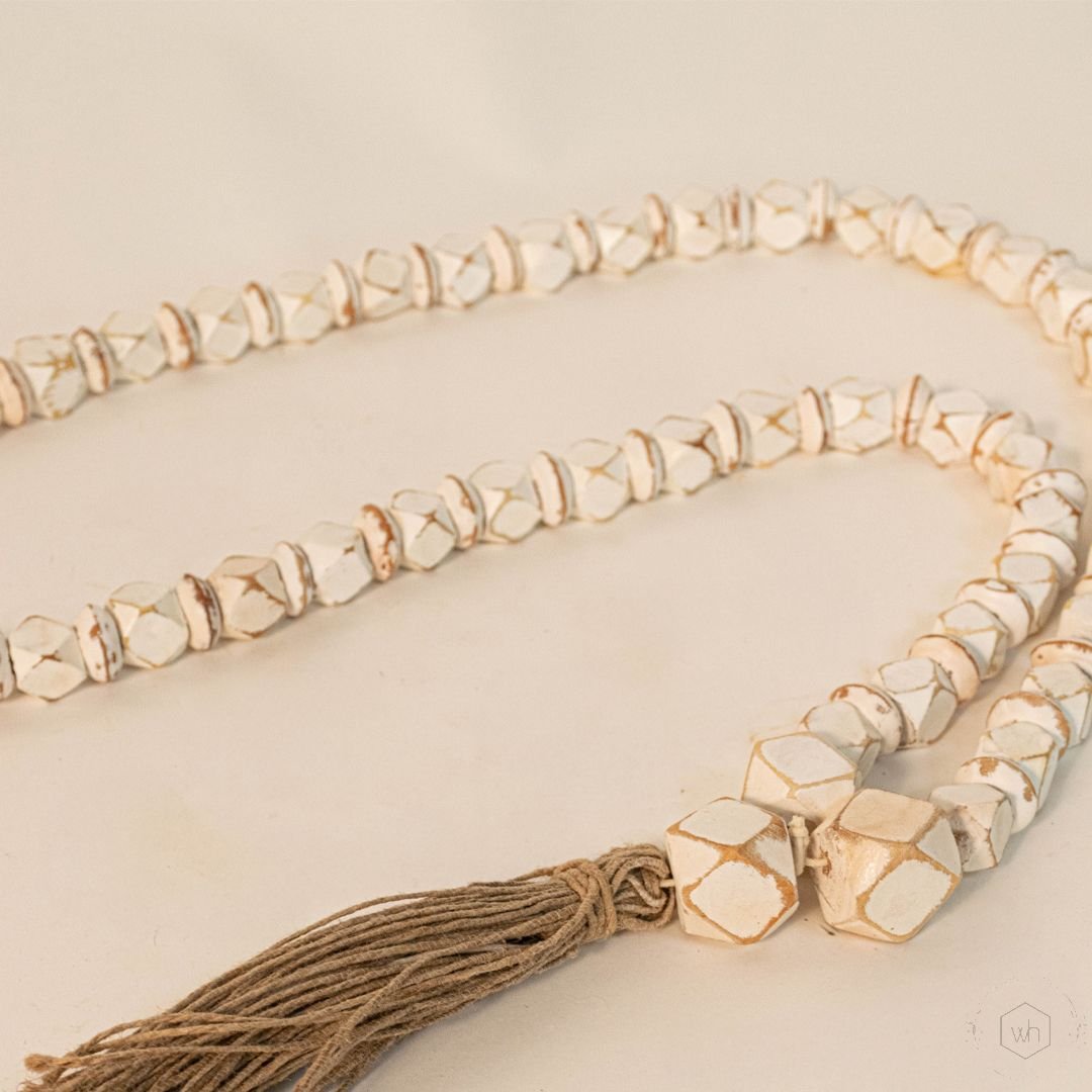 The Coastal Farmhouse Bead Tassel Garland in White Wood is a charming decorative accent that blends rustic elegance with coastal-inspired style. Featuring smooth white wooden beads finished with soft tassels, this garland adds warmth and texture to trays, mantels, and tabletops.