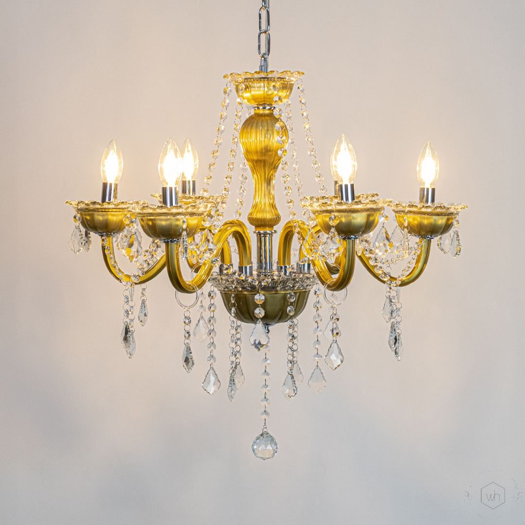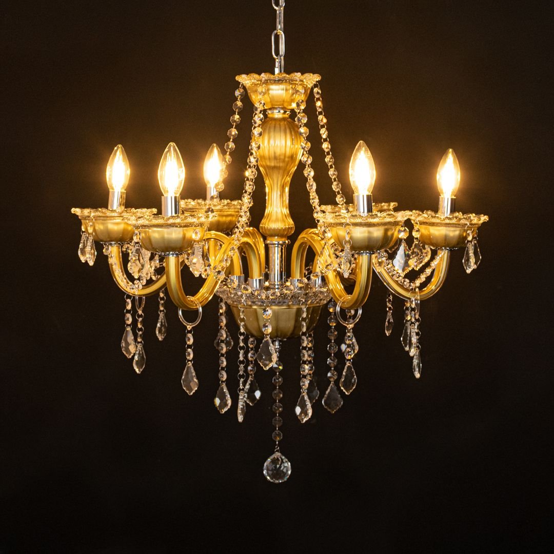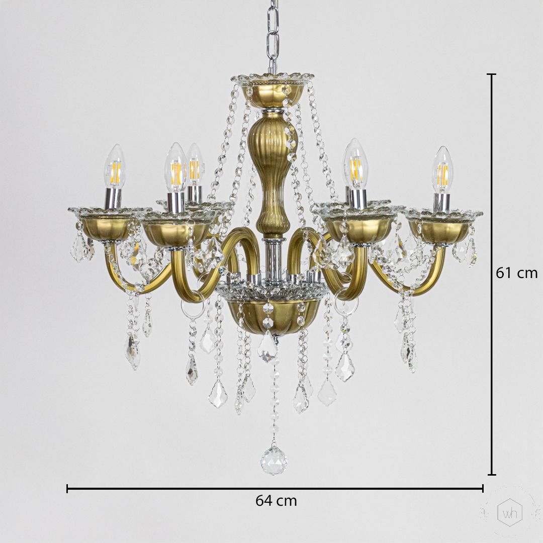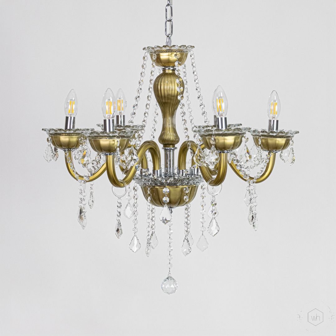 The Elysia 6-Light Crystal Chandelier is a stunning blend of gold-toned metal, transparent glass arms, and premium crystal droplets. Designed to create a warm and luxurious glow, it adds timeless elegance and refined beauty to any interior setting.