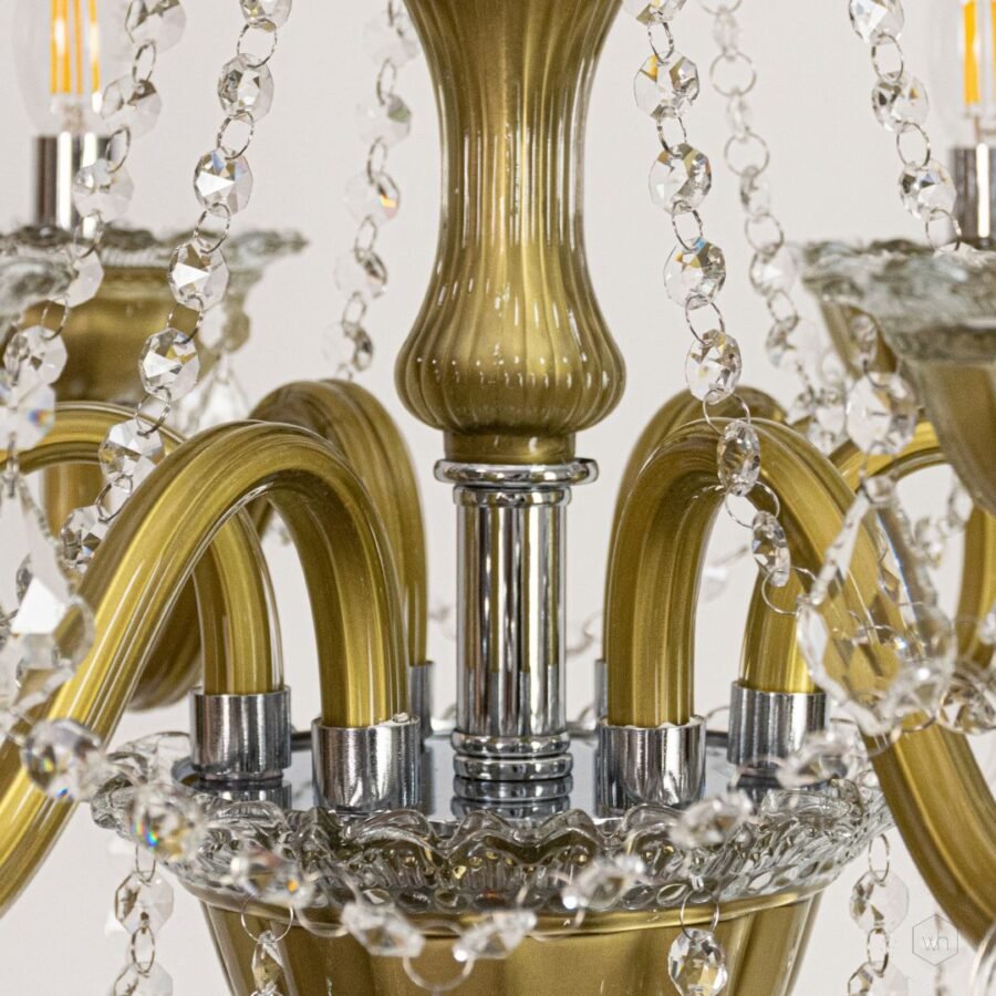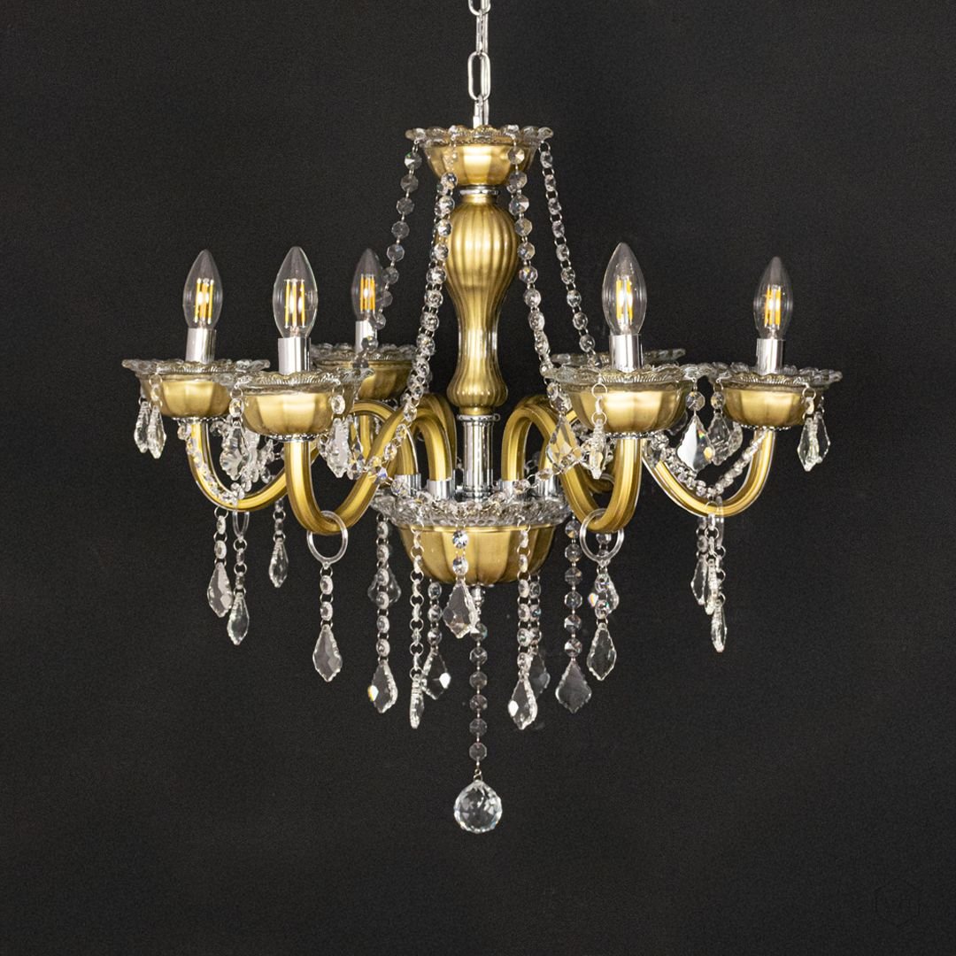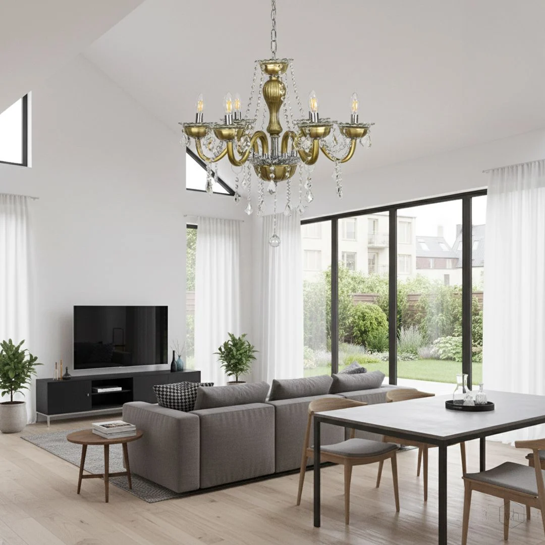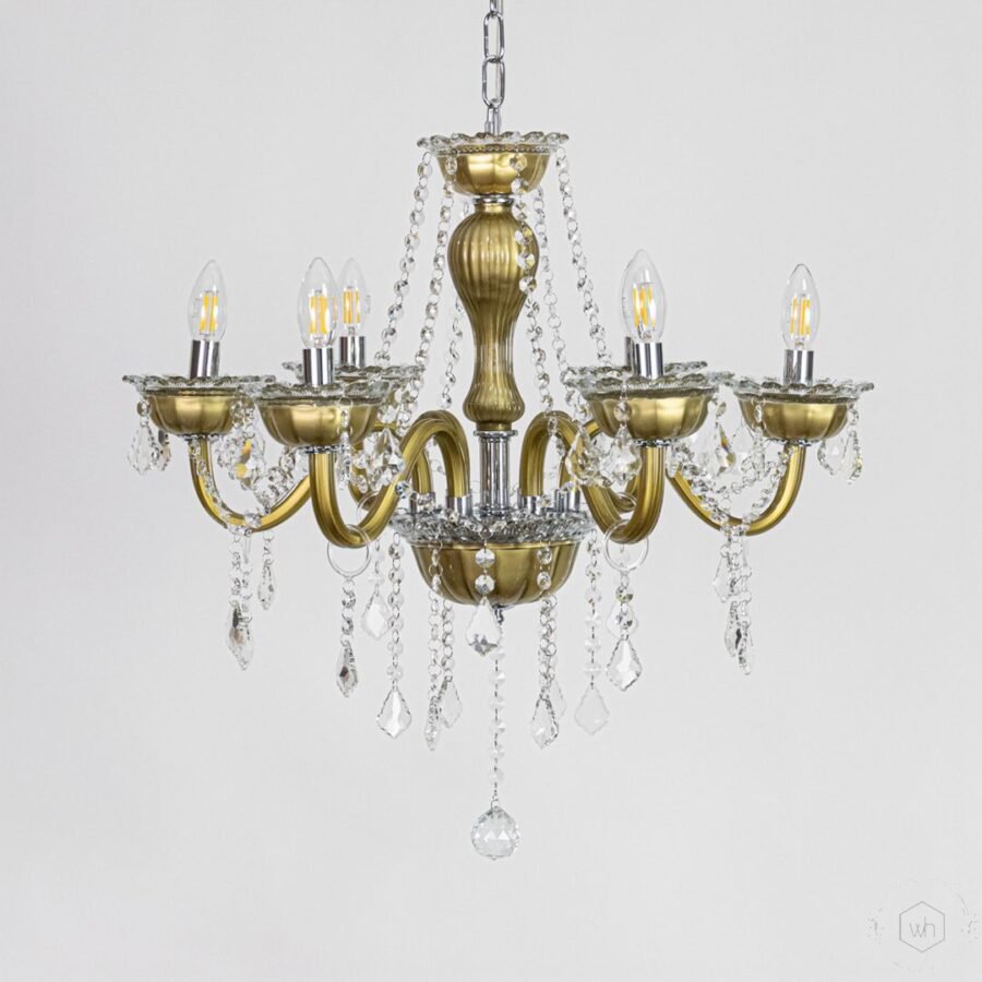 The Elysia 6-Light Crystal Chandelier is a stunning blend of gold-toned metal, transparent glass arms, and premium crystal droplets. Designed to create a warm and luxurious glow, it adds timeless elegance and refined beauty to any interior setting.