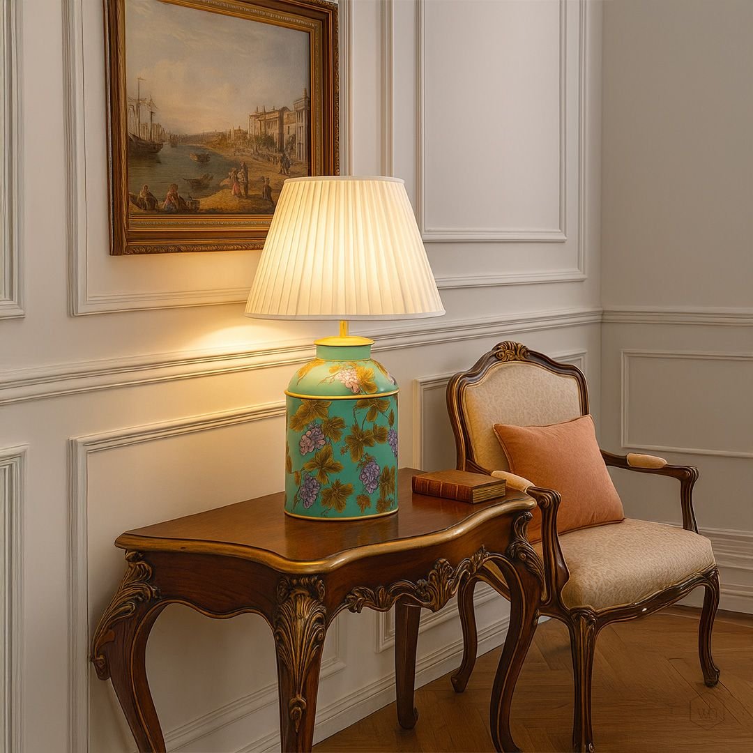 The Grape Vine Blue Metal Table Lamp with Off White Pleated Lampshade brings refined elegance and organic charm to your dining area. Inspired by vineyard landscapes, it combines natural allure with sophisticated design, adding a touch of rustic grace and contemporary style.