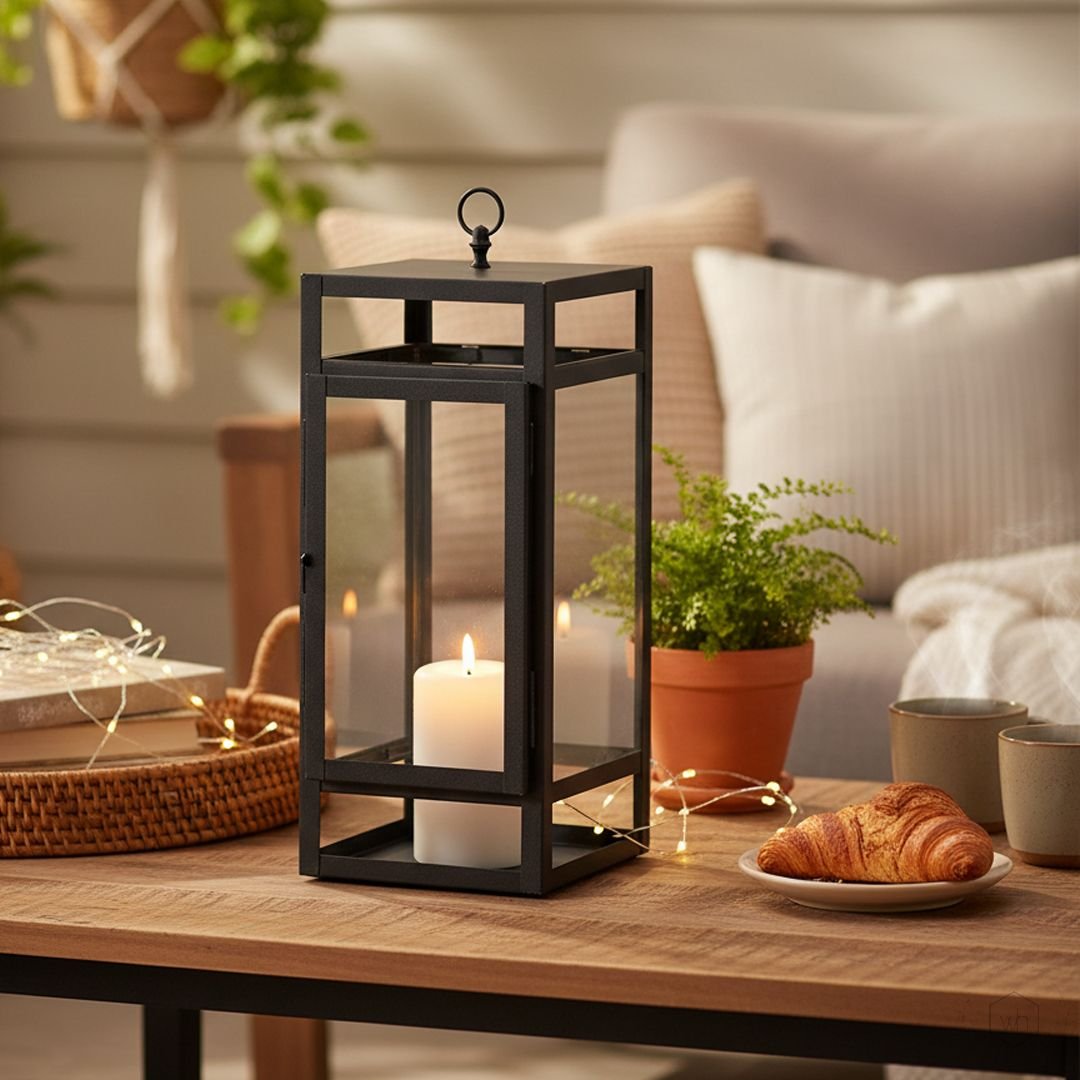 The Mesa Metal Lantern in black brings sleek modern charm to any setting. Its structured silhouette and glass-paneled body create an elegant play of light and shadow, making it a versatile décor piece for both indoor and outdoor styling.
