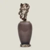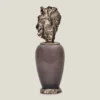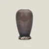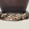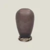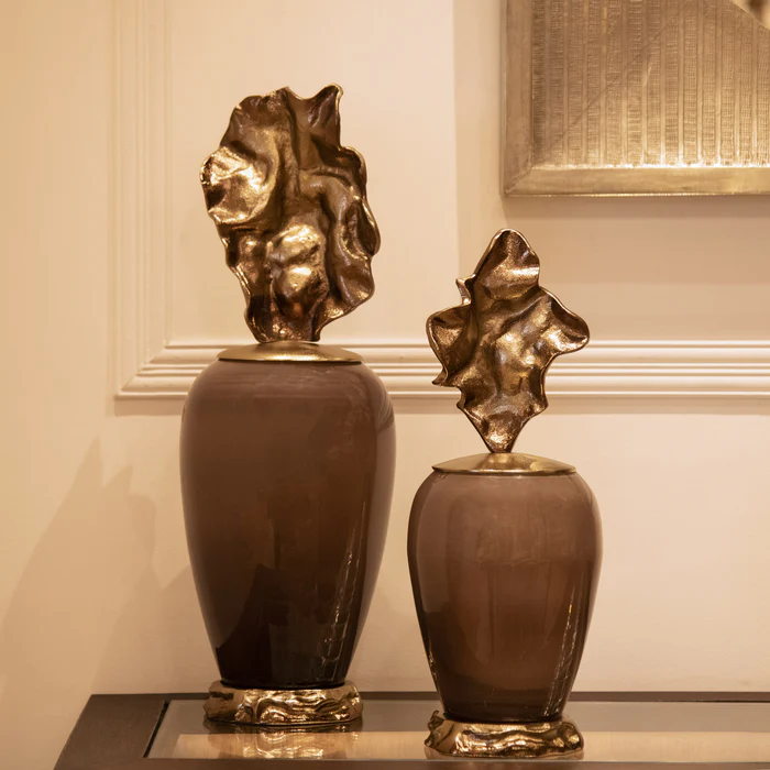 An abstract-shaped rumpled surface casted in metal with a lustrous gold finish is perched atop as a lid of this Eternity Decor Jar. The oblong rounded form of the jar in brown glass creates a stunning look with its modern dramatic design.