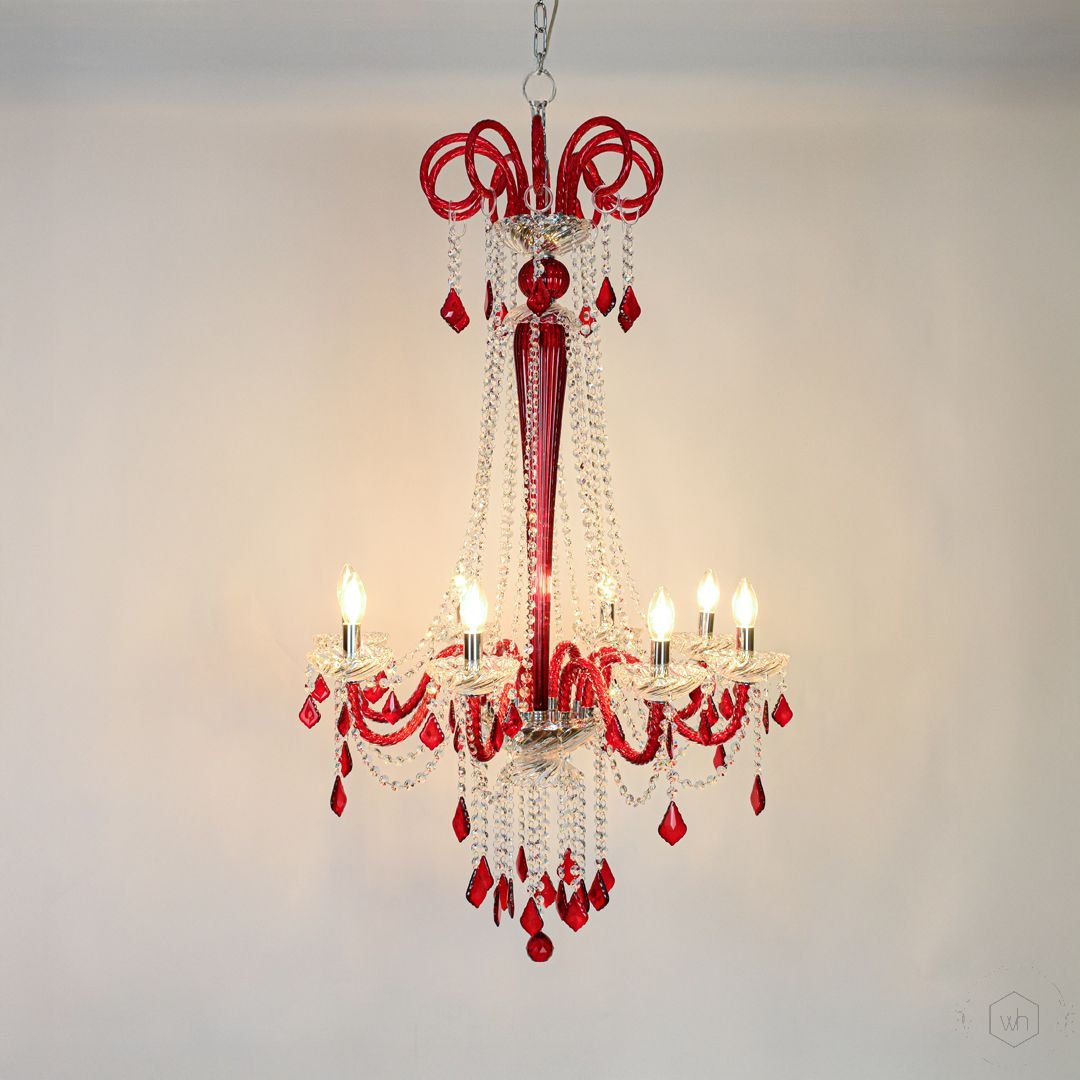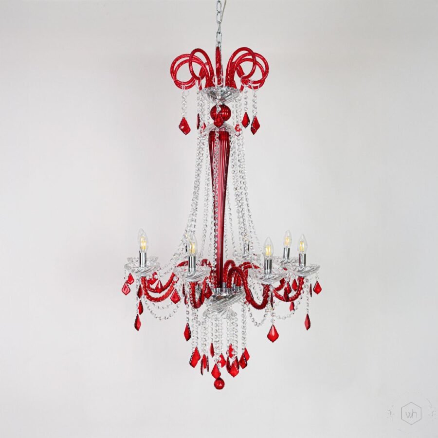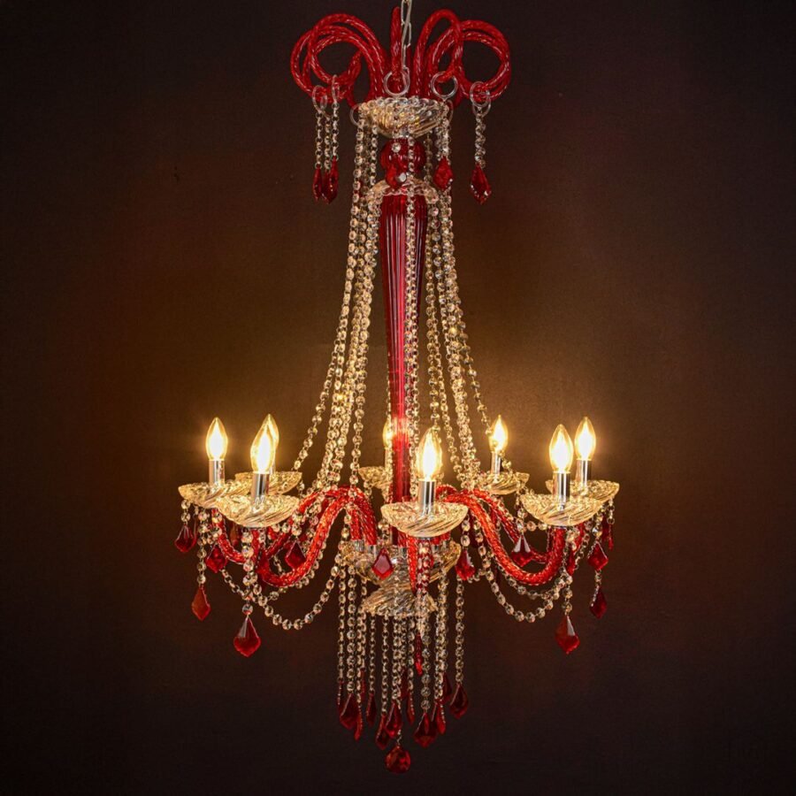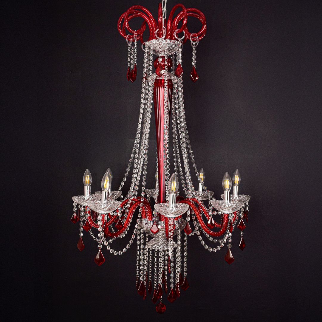 The Noir Royal Crystal Chandelier in Red brings dramatic beauty and luxurious elegance to any space. Designed with transparent glass arms, red crystal droplets, and a polished metal frame, it creates a vibrant and eye-catching illumination that becomes the centerpiece of any room.