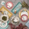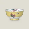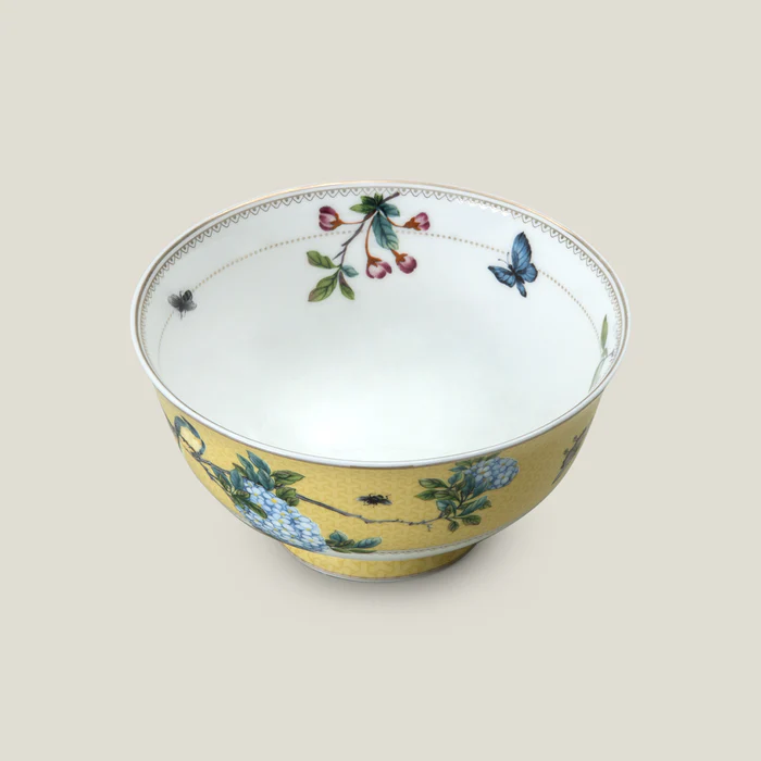 Sophisticated & sublime comes Sakura. An Oriental art inspired floral branch alongside a butterfly festoon this Yellow Serving Bowl with geometrical woven grid pattern base. Bring together the other colored components from this collection to create a cheerful & elegant tablescape.